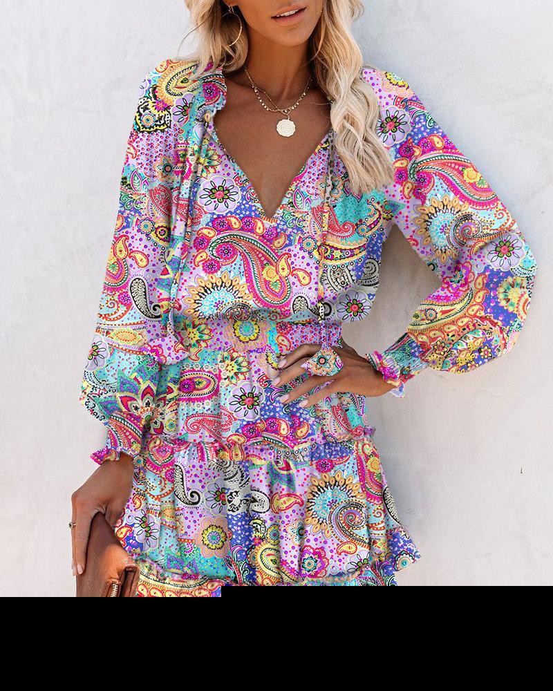 Long Sleeved V-Neck Fashionable Printed Waistband Dress for Women